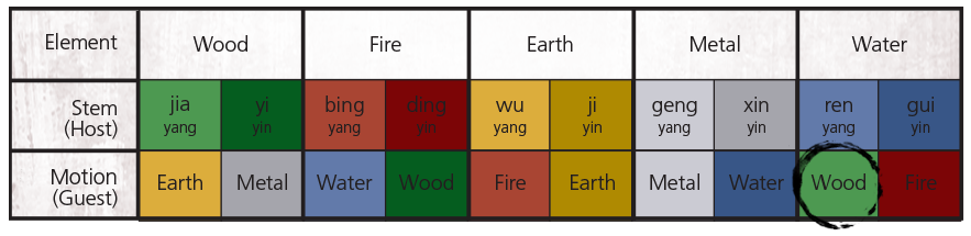 The first aspect of Wu Yun Liu Qi theory is Wu Yun, or 5 Motions. These motions are essentially 10 ‘guest’ influences that alternate yearly (a Yin and Yang of each of the Five Elements). These guest influences overlay the normal ‘host’ positions, which are based on the Tian Gan Di Zhi calendar above. In the same way that a guest in your home will change the overall vibe, the guest influences as indicated by Wu Yun Liu Qi will change the normal dynamics of the standard host positions indicated by the Tian Gan Di Zhi calendar. This year the host position is Yang Water, which you can see in the above chart. The guest influence is Yang Wood (also called Excessive Wood). The chart that matches host elements (Tian Gan) to guest elements (Wu Yun) looks like this: