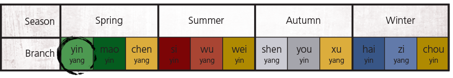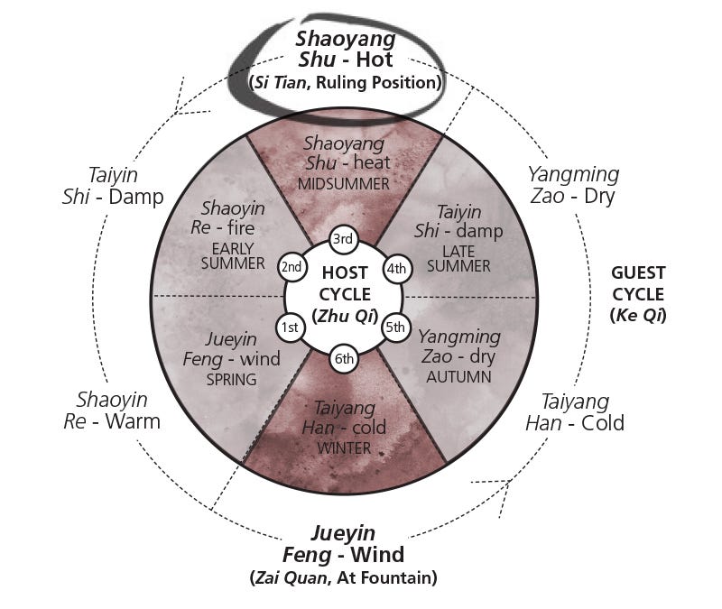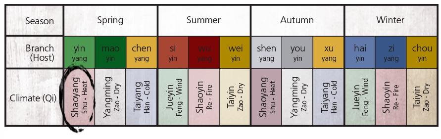 The second part of the equation is the Liu Qi, which is a kind of climatic guest influence. The six Qi are Jueyin (Wind), Shaoyin (Fire), Shaoyang (Heat), Taiyin (Damp), Yangming (Dry), and Taiyang (Cold). This year is governed by Shaoyang, which represents Heat. Shaoyang is in a position called the Ruling Position of the Cosmos (司天 Sī tiān) and rules the first part of the year. There’s a second important position called Position at the Fountain (在泉 Zài quán) which this year this is Jueyin, representing Wind, and rules the second part of the year. Each of the Earthly Branches is paired with one of the six Qi (and its corresponding climate). Overall, the chart looks like this: