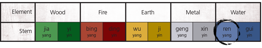 Before discussing Wu Yun Liu Qi, you will need a basic understanding of the traditional solar-lunar calendar Cosmic Stems Earthly Branches (天干地支 Tiān gān dì zhī). Let’s start with this year, 2022. The Tian Gan Di Zhi calendar indicates that 2022 is a Yang Water year, called Ren Yin. The names of each year can be calculated with a chart like this: